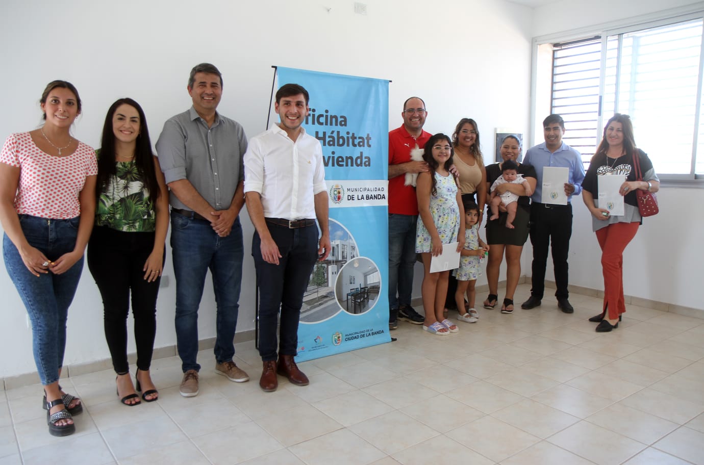 Durante la entrega estuvieron presentes el secretario de Coordinación y Desarrollo Territorial de la Municipalidad de La Banda, Matías Nediani; la secretaria de Gobierno, Victoria Torres; el coordinador de la Oficina de Hábitat y Vivienda, Cesar Bendezu, la secretaria de Comunicación, Fernanda Raschi, demás autoridades y familias adjudicatarias.