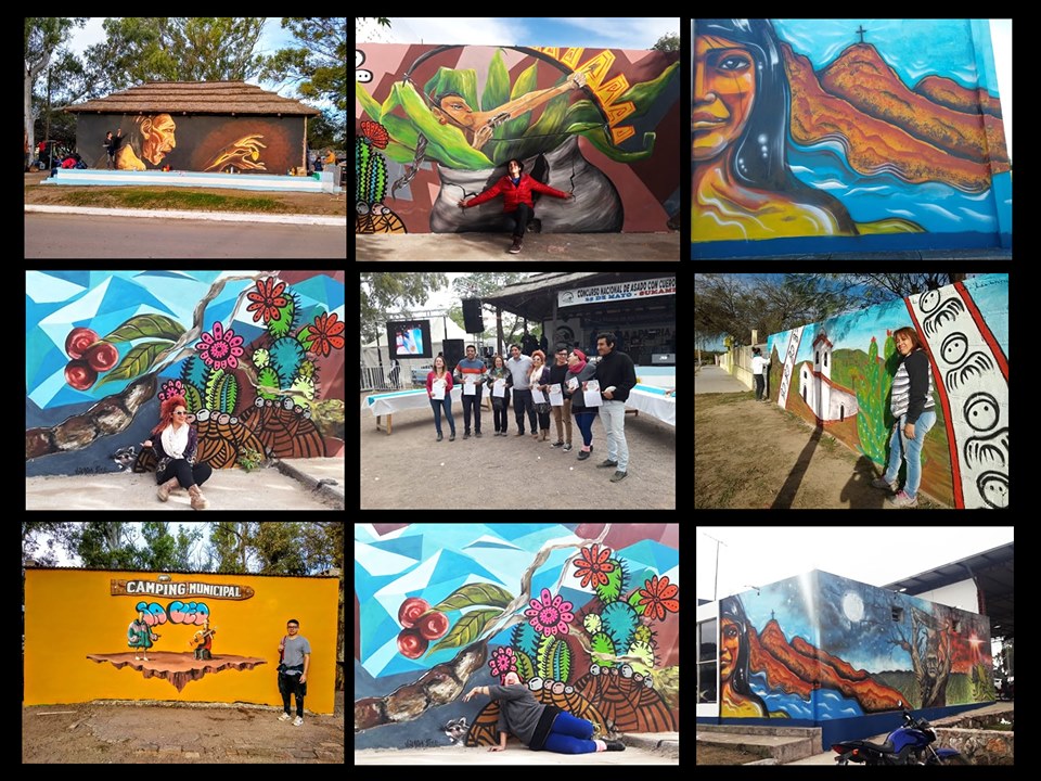 Durante el encuentro, los artistas plásticos trabajaron sobre las paredes de la sede del Club Unión Argentino, la Terminal de ómnibus y el escenario del camping municipal, para plasmar los murales con un fuerte sentido histórico cultural de nuestros ancestros.