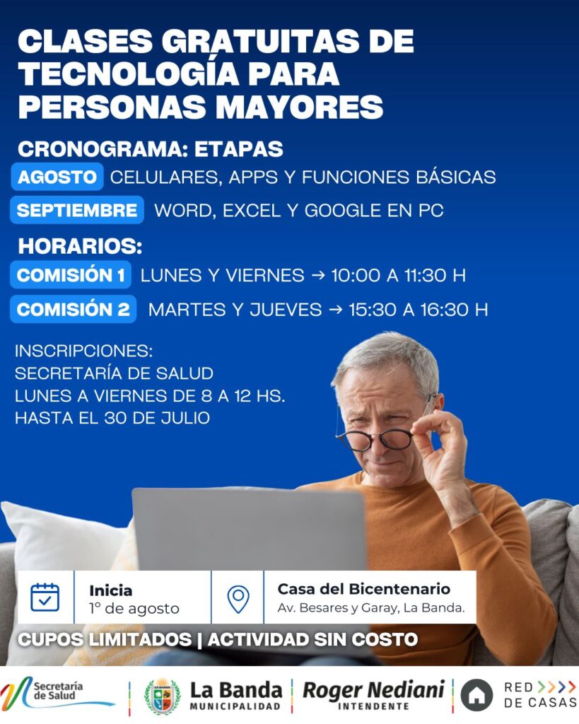 La Oficina del Adulto Mayor, dependiente de la Secretaría de Salud de la Municipalidad de La Banda, en articulación con Punto Digital de la Casa del Bicentenario, informa que están abiertas las inscripciones para el nuevo ciclo de capacitaciones tecnológicas destinadas a adultos mayores, que dará inicio el próximo 1° de agosto.