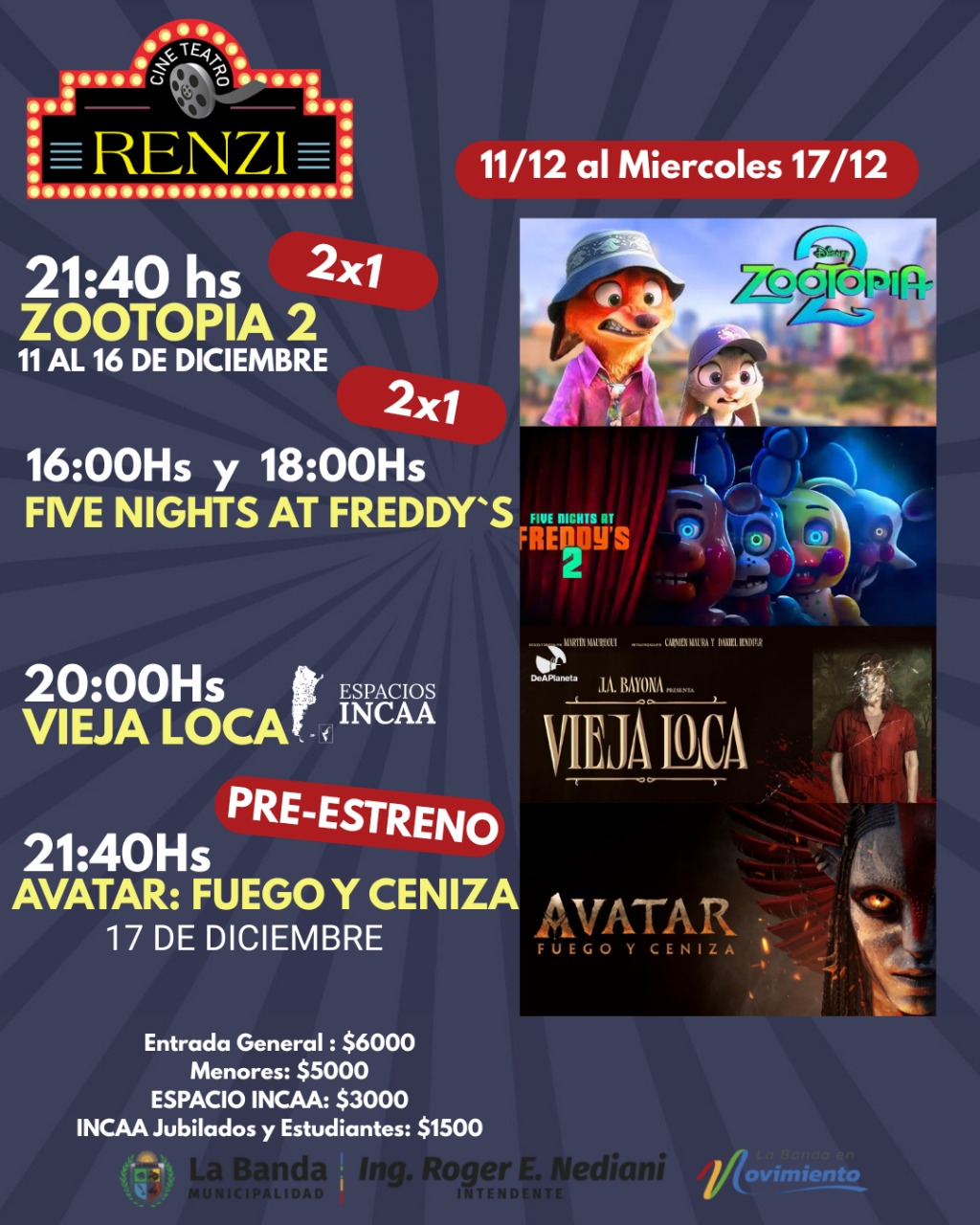 El Cine Teatro Municipal Renzi de la ciudad de La Banda, renovará su cartelera con las películas “Five Nights at Freddy’s 2”, “Vieja loca” y anuncia el preestreno de “Avatar: Fuego y ceniza”, el miércoles 17 de diciembre, a las 21:40.