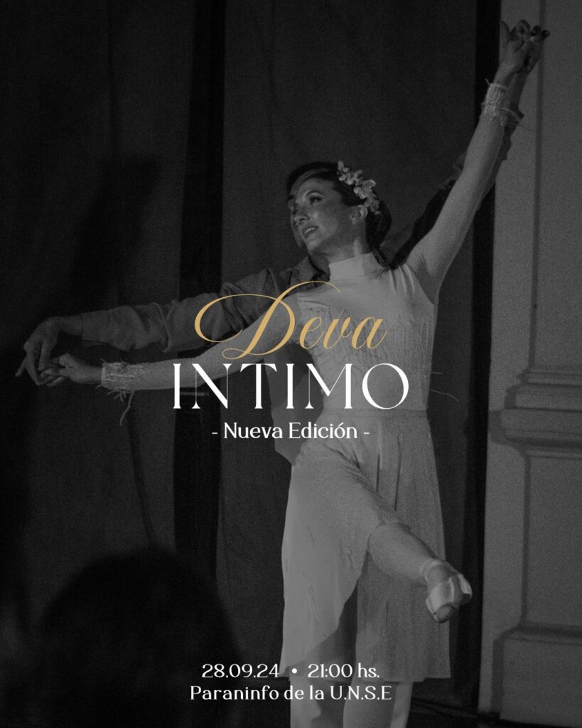 El próximo sábado 28 de septiembre de 2024, el Paraninfo de la Universidad Nacional de Santiago del Estero (UNSE) será el escenario de una edición especial de ‘Deva íntimo’, una destacada gala de ballet que cautivó al público en su estreno en agosto de este año. El evento, que comenzará a las 21:00, promete una noche de danza y música en vivo, fusionando lo clásico con lo contemporáneo en un espectáculo único.