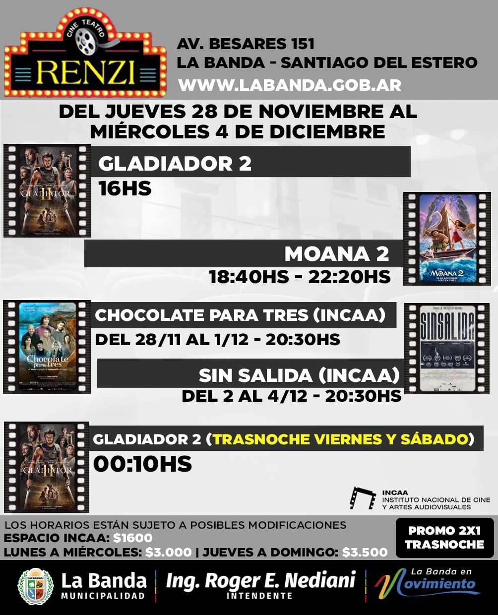 El Cine Teatro Renzi dependiente de la Secretaría de Comunicación de la Municipalidad de La Banda, dio a conocer la nueva cartelera de películas que se proyectarán en la histórica sala desde el jueves 28 de noviembre hasta el miércoles 4 de diciembre.