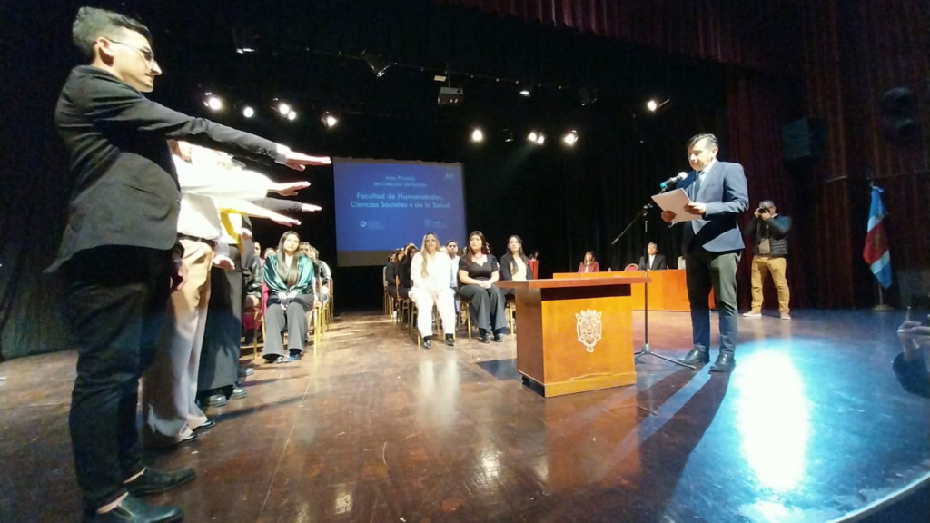 Autoridades universitarias participaron del emotivo acto de colación de nuevos profesionales egresados de la Facultad de Humanidades, Ciencias Sociales y de la Salud de la UNSE, donde recibieron certificados de egreso graduados de las distintas carreras de la unidad académica.