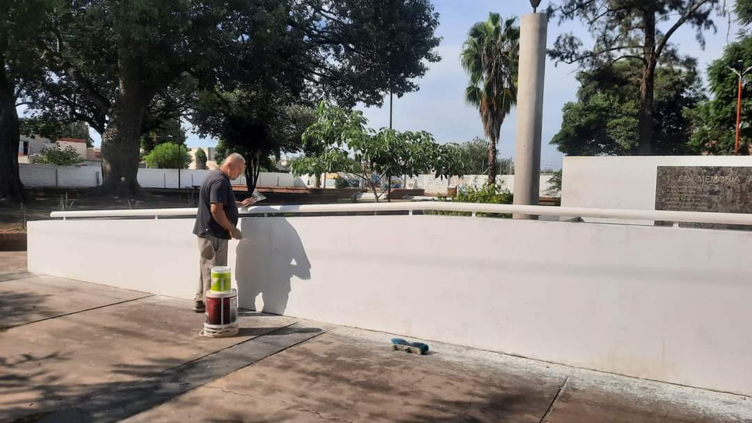 La Sección Pintores, cumple en la plazoleta Islas Malvinas, con las tareas de lijado de paredes, bancos y monolito y mantenimiento general de pintura en todo este espacio.