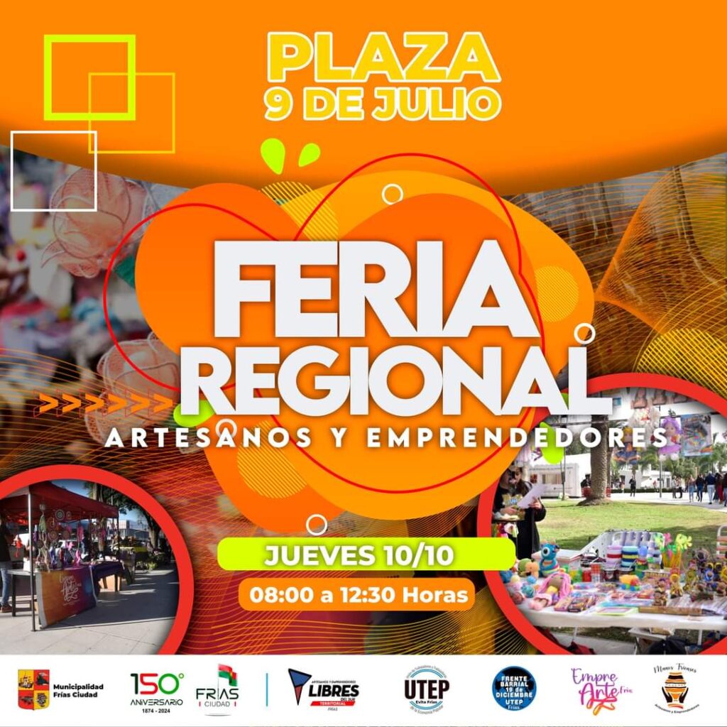Este jueves 10 en el horario de 8 a 12:30 se realizará en la plaza 9 de Julio, una nueva feria regional de artesanos y emprendedores organizada por la Municipalidad de Frías a través de la Secretaría de Producción y Turismo.