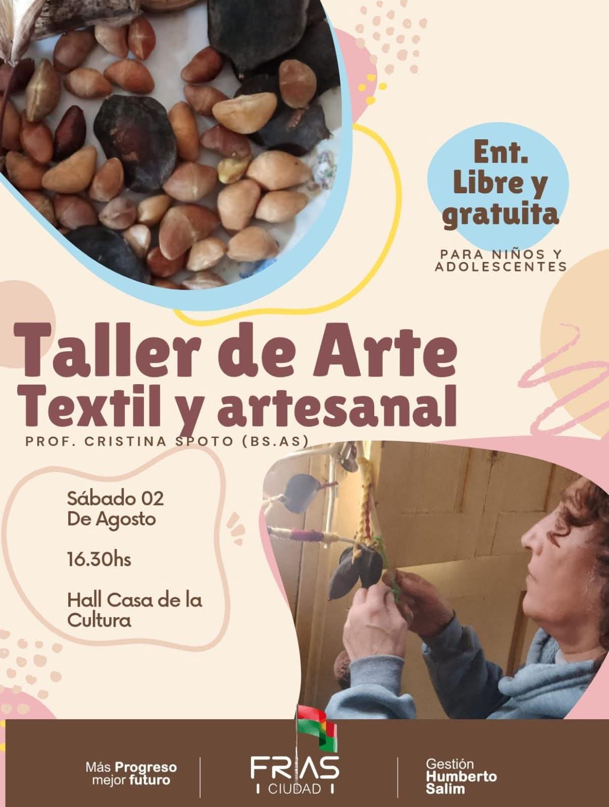 La Municipalidad de Frías, a través de la Secretaría de Gobierno y la Comisión Municipal de Cultura, invita a la comunidad a participar del Taller de Arte Textil y Artesanal, que se llevará a cabo el próximo sábado 2 de agosto, a partir de las 16:30 horas, en el hall de la Casa de la Cultura.