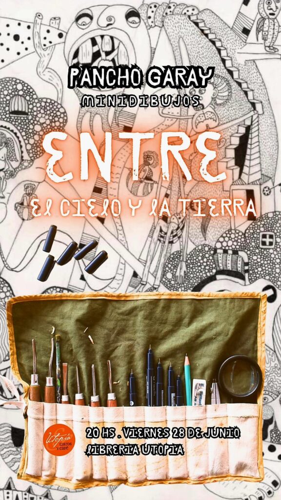 A partir del viernes 28 de junio a las 20hs. en la Librería Utopía libros y café, quedará Inaugurada la muestra de minidibujos “Entre el cielo y la tierra” del artista plástico y músico, Francisco “Pancho” Garay.