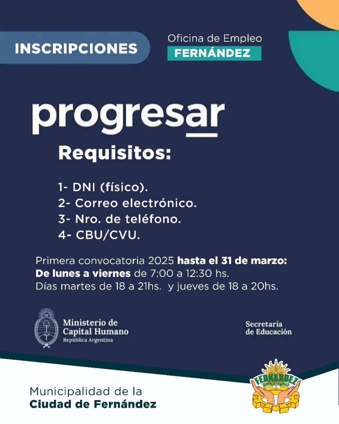 La Oficina de Empleo de la ciudad de Fernández informa a al comunidad que se encuentran abiertas las inscripciones para acceder a las Becas Progresar.