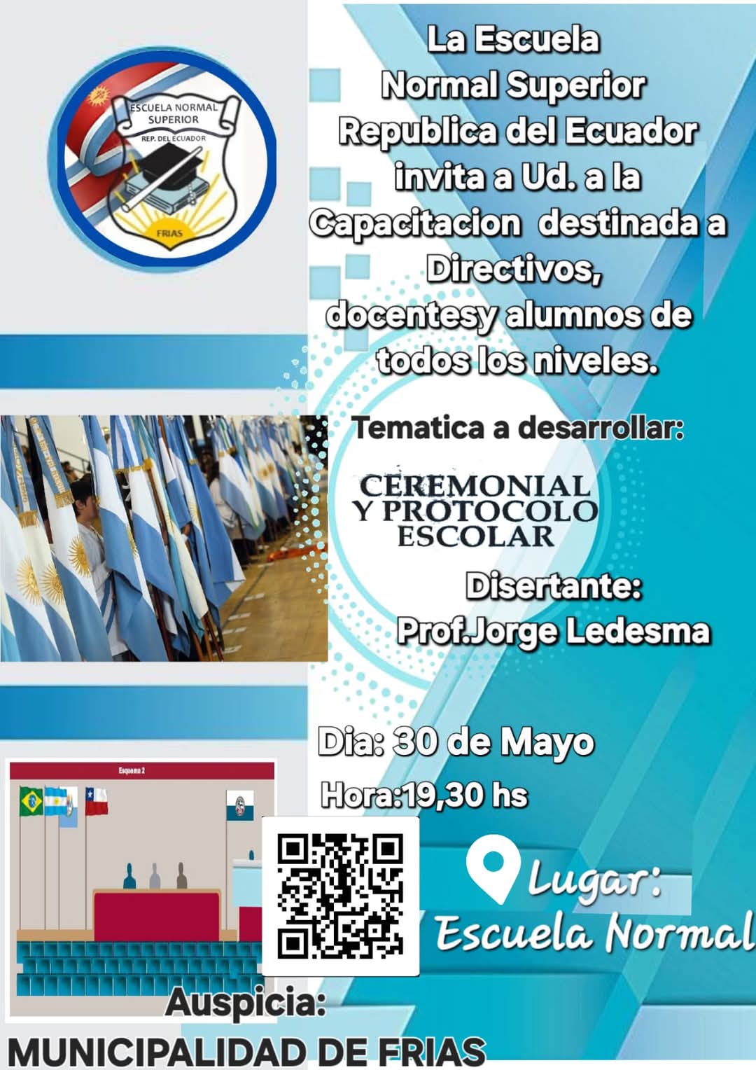 Con el auspicio de la Municipalidad de Frías, la Escuela Normal Superior “República del Ecuador” llevará a cabo un curso de capacitación sobre Ceremonial y Protocolo Escolar, destinado a directivos, docentes y estudiantes de todos los niveles educativos.
