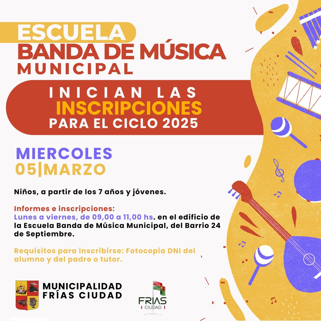 La Municipalidad de Frías, informa que a partir del miércoles 5 de marzo, estarán abiertas las inscripciones para ingresar a la Escuela Banda de Música Municipal “Manuel Clemente Tenreyro”.