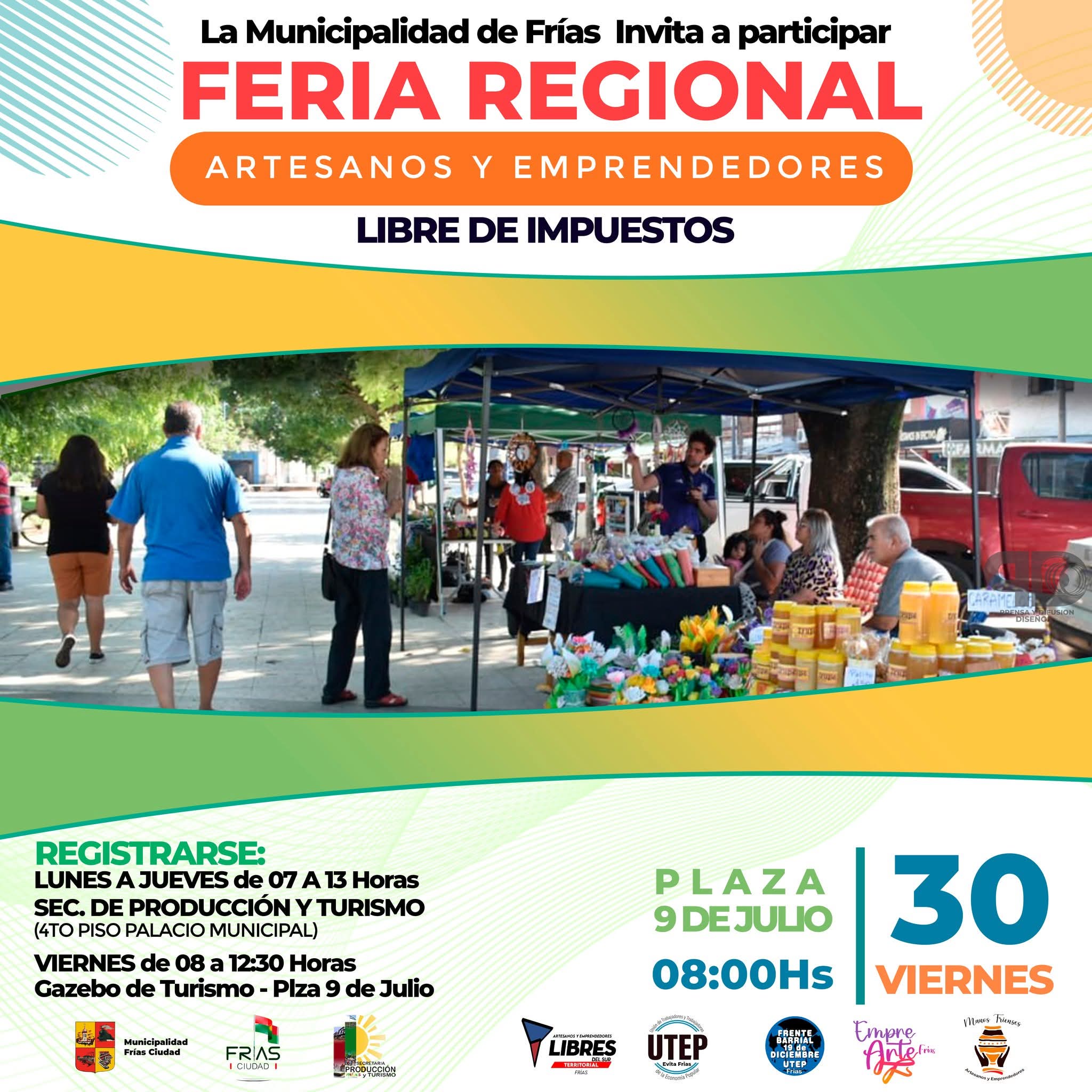 La Municipalidad de Frías, a través de la Secretaría de Producción y Turismo, invita a participar de una nueva edición de la Feria Regional de Artesanos y Emprendedores, el próximo viernes 30 de mayo, a las 08 horas en la Plaza 9 de Julio.