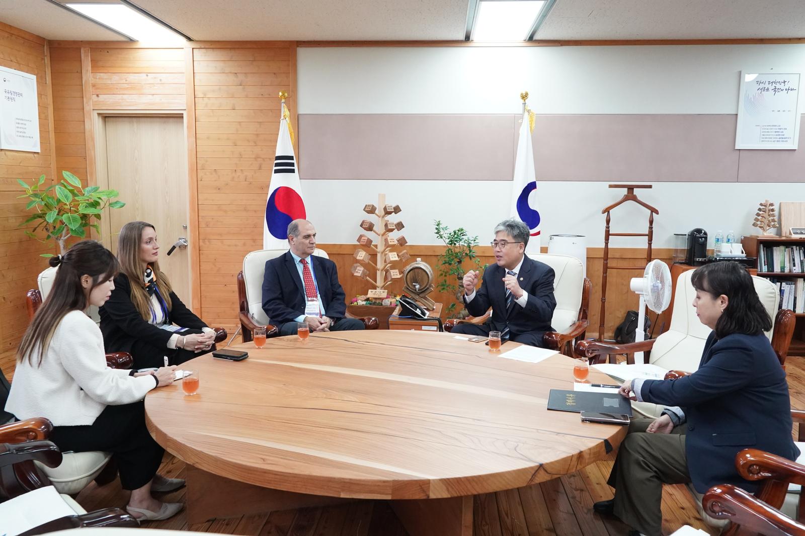 Este martes, los funcionarios santiagueños visitaron el Servicio Forestal Nacional, donde mantuvieron una reunión ejecutiva con el ministro del área, Dr. Lim Sang Seop, en la cual se evaluó la posibilidad de intercambios con el Gobierno de Santiago del Estero en diversas temáticas.