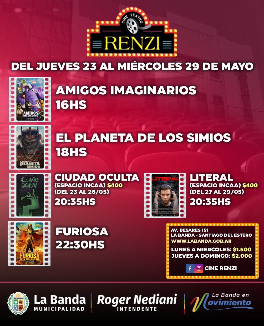 El Cine Teatro Municipal Renzi dependiente de la Secretaría de Comunicación renueva su cartelera desde el jueves 23 al miércoles 29 con las películas “Amigos imaginarios”; “El planeta de los simios”; “Furiosa” y como parte del espacio INCAA “Ciudad oculta” y “Literal”.