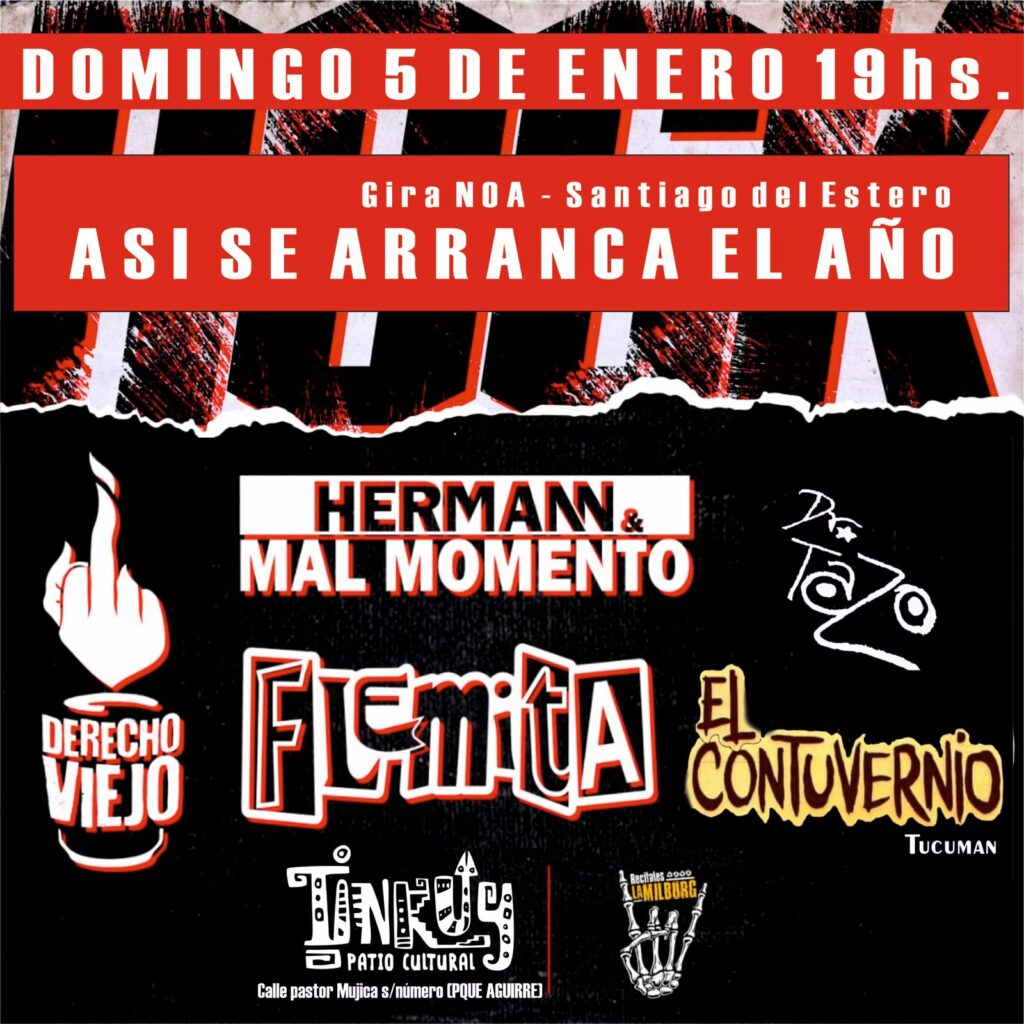 Mal Momento y Flemita, con más de 30 años de trayectoria, serán los protagonistas de una tarde noche, junto a El Contuvernio, de Tucumán, y Derecho Viejo y el Dr. Tazo, de Santiago del Estero. El evento es parte de la “Gran Gira Norte” y se espera que sea una fecha emocionante para los fieles del punk rock.