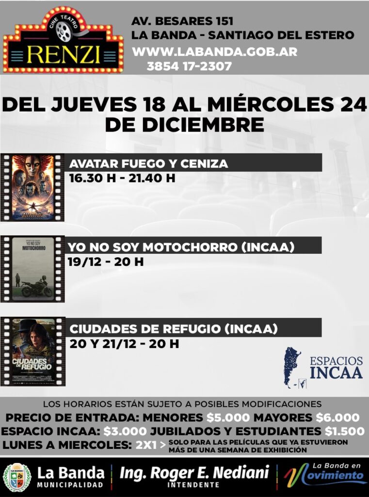 La cartelera del cine teatro Renzi de La Banda se renueva con dos estrenos de producción nacional como parte del Espacio INCAA desde el jueves 18 hasta el martes 23.