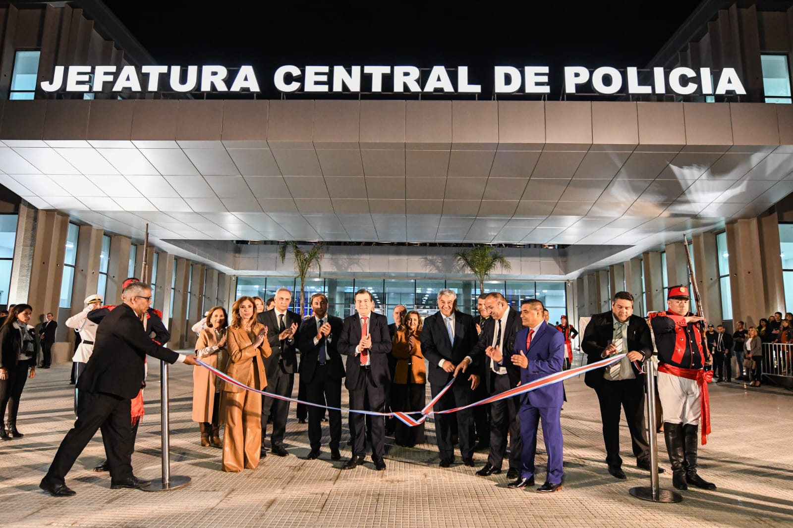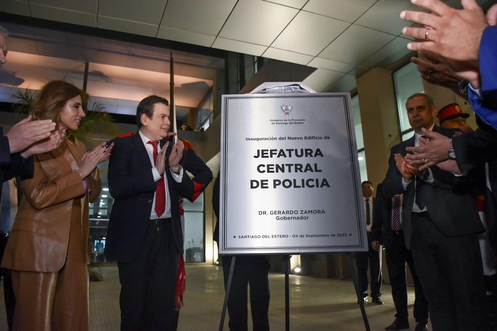 El gobernador Gerardo Zamora, acompañado por la presidenta provisional del Senado, Claudia Ledesma Abdala de Zamora, encabezó el acto de inauguración del nuevo edificio de la Jefatura Central de Policía, uno de los más modernos del país, que cuenta con dos niveles con una superficie de 7.200 metros cuadrados, ubicado en avenida Roca Norte, delimitado por las calles Carranza, Juana Manuela Gorriti Norte y Taboada, en el barrio Juan XXIII.