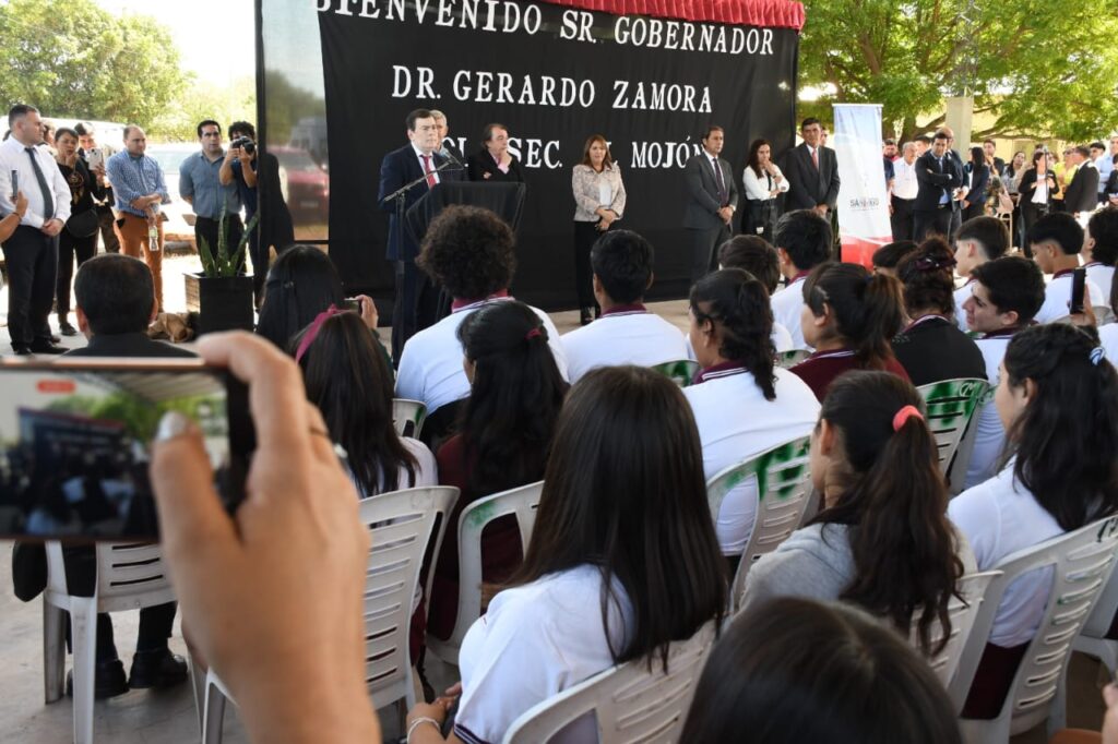 Con la presencia del gobernador Gerardo Zamora fue habilitado este lunes el renovado Colegio Secundario de localidad de El Mojón, cuyo edificio fue ampliado con cinco aulas, una galería, sanitarios y refaccionado por completo. Además, fue equipado con mobiliario, herramientas tecnológicas y demás materiales para 398 alumnos.