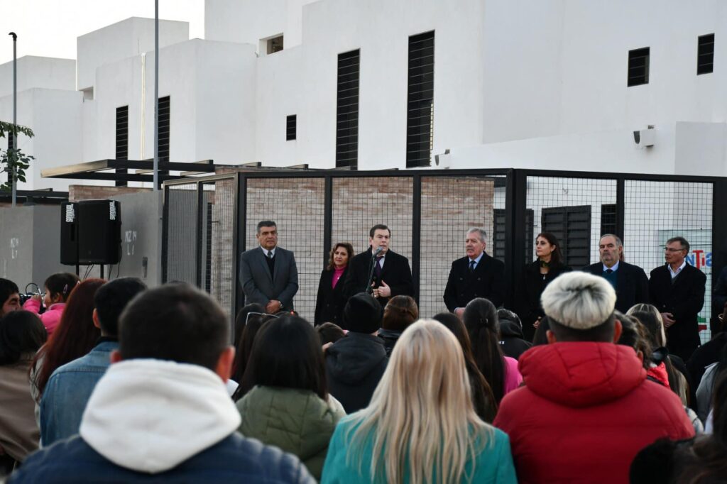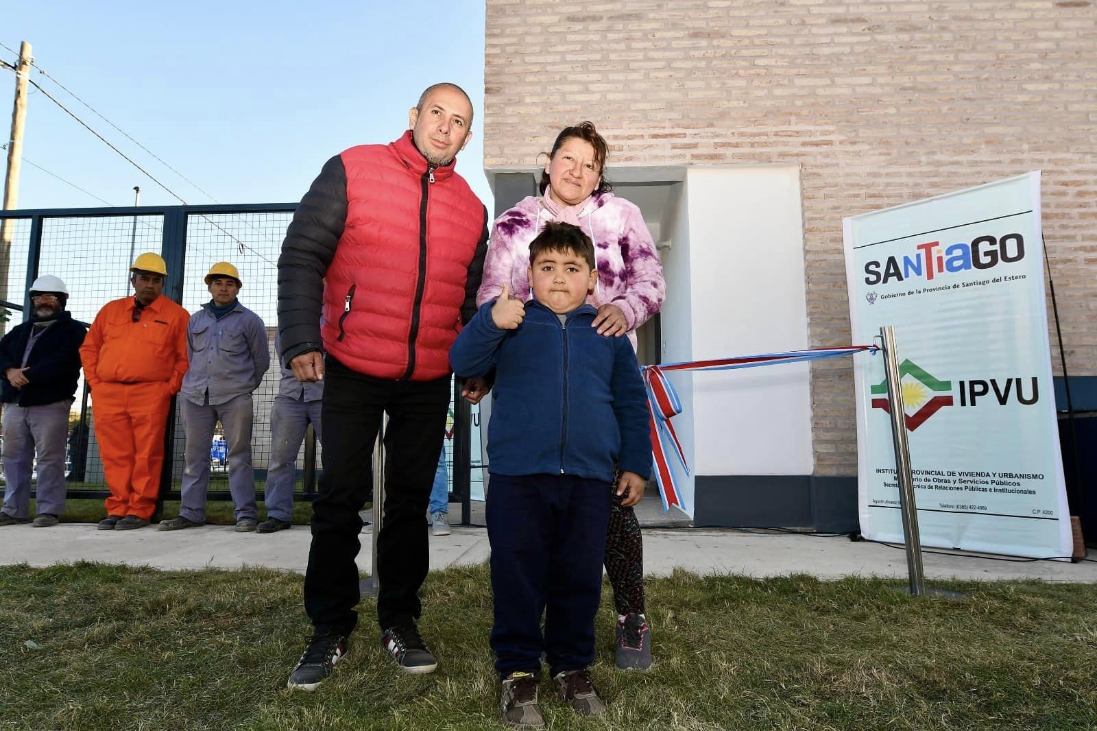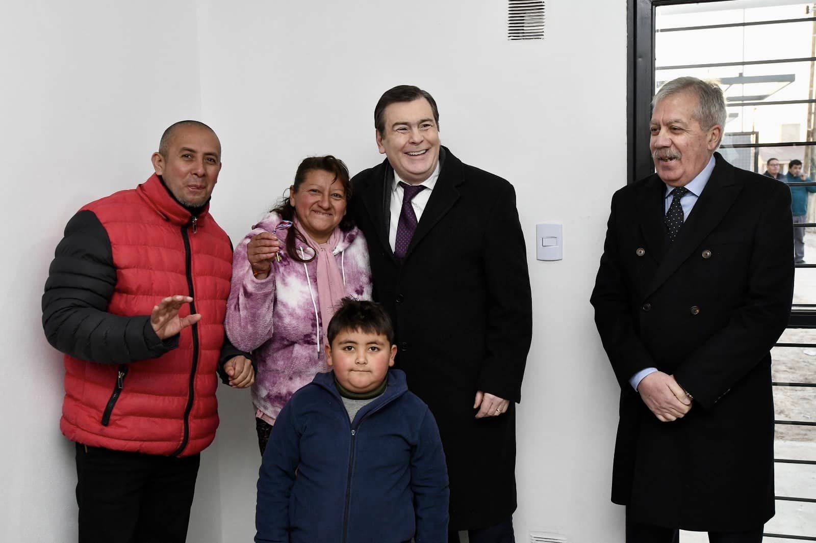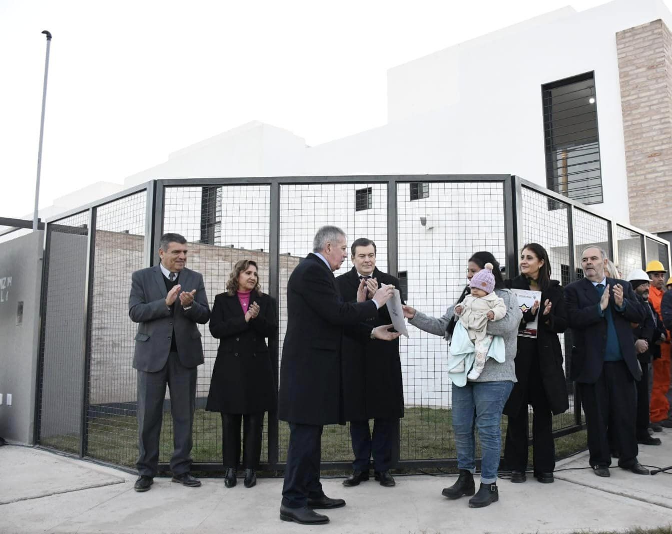 El corte de cintas y entrega de carpetas a los adjudicatarios se realizó en el flamante hogar de Cesar Adrián Moreno y Marta Liliana Barrientos, donde el mandatario estuvo acompañado por el jefe de Gabinete, Elías Suárez; los ministros de Obras Públicas, Aldo Hid; de Gobierno, Marcelo Barbur; y de Producción, Miguel Mandrile; el secretario de Obras Públicas, Jorge Zuaín; la secretaria técnica de Relaciones Públicas e Institucionales del IPVU, Sara Ayuch Tarchini, y la intendente Norma Fuentes, entre otras autoridades.