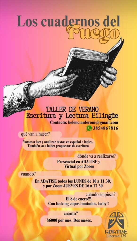 En Adatise, Libertad 175, dará inicio el taller “Los Cuadernos del Fuego” a partir del 8 de enero. Este taller, que busca fomentar la apreciación de la literatura en inglés y español, estará a cargo de María Belén Cianferoni Figueroa