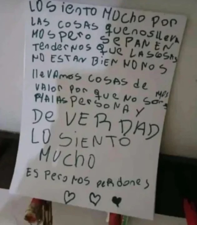 “Lo sentimos mucho por las cosas que nos llevamos, pero sepan entendernos, que las cosas no están bien. No nos llevamos cosas de valor porque no somos malas personas y, de verdad, lo siento mucho. Espero nos perdones”, expresa la carta, que al final cierra con tres corazones.