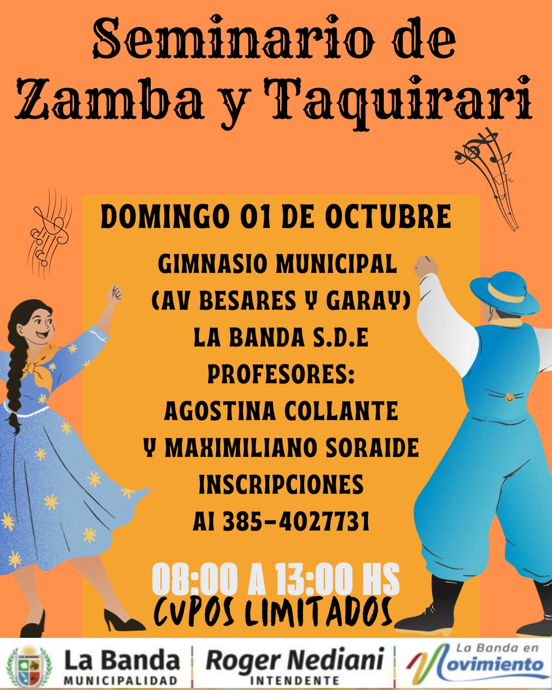 La Municipalidad de La Banda invita a toda la comunidad a participar del “Seminario de Zamba y Taquirari”, que se realizará el domingo 1 de octubre desde las 8.30 en el Gimnasio Municipal sito Besares y Lavalle.
