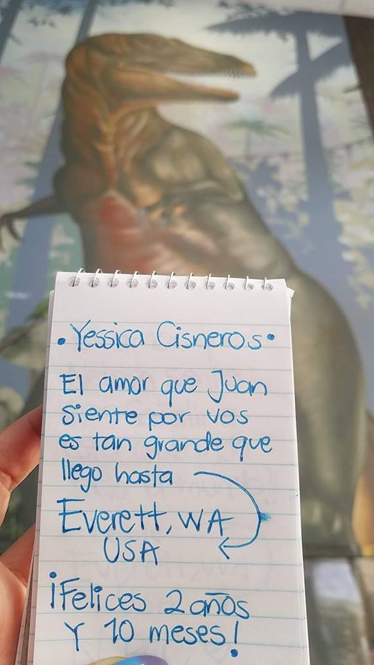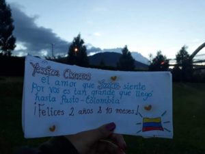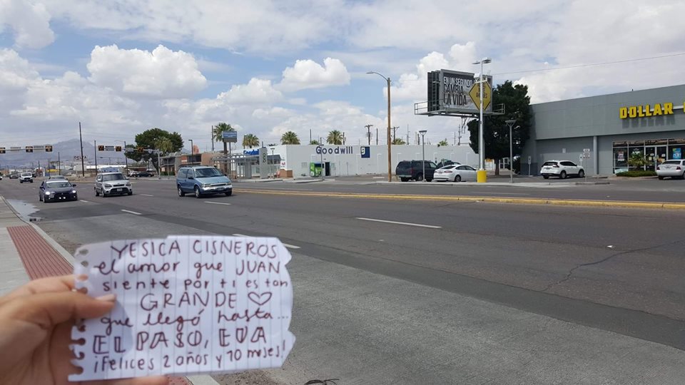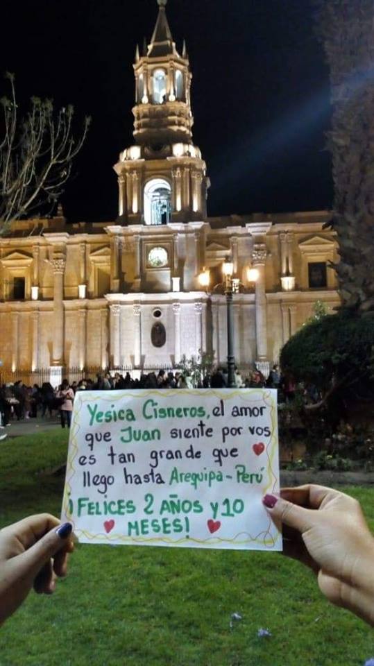 Con la ayuda de personas de distintos puntos del mundo, le preparó una declaración de amor muy original: “Yésica, el amor que Juan siente por vos es tan grande que llegó a …” citaba la frase en un cartel escrito a mano por personas de Perú, Chile, México, Estados Unidos, Colombia y Costa Rica que los mostraban en lugares representativos de sus respectivos países.