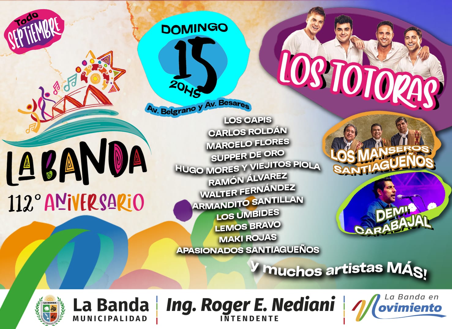 Con motivo de celebrarse el 112º aniversario de la ciudad, el intendente Ing. Roger E. Nediani invita a los vecinos bandeños a participar del tradicional acto protocolar, desfile cívico y festejo central, que se realizará el próximo lunes 16.