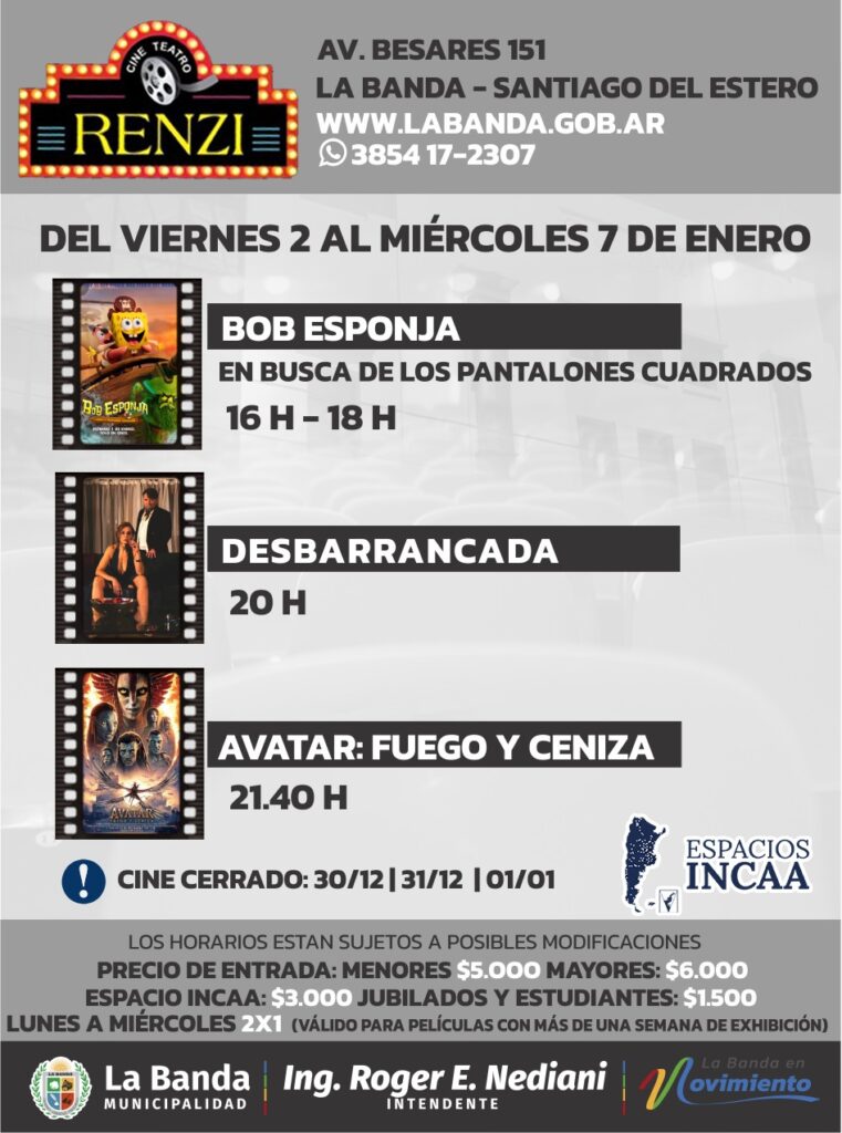 Por último, se informa que el Cine Teatro Renzi permanecerá cerrado los días 30 y 31 de diciembre y 1 de enero, con motivo de las celebraciones de fin de año.