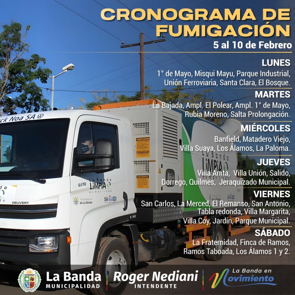 La Municipalidad de La Banda dio a conocer el cronograma de Fumigación desde el lunes 5 al 10 de febrero que el equipo de la Secretaría de Servicios Públicos llevará a cabo en diferentes barrios de la ciudad.
