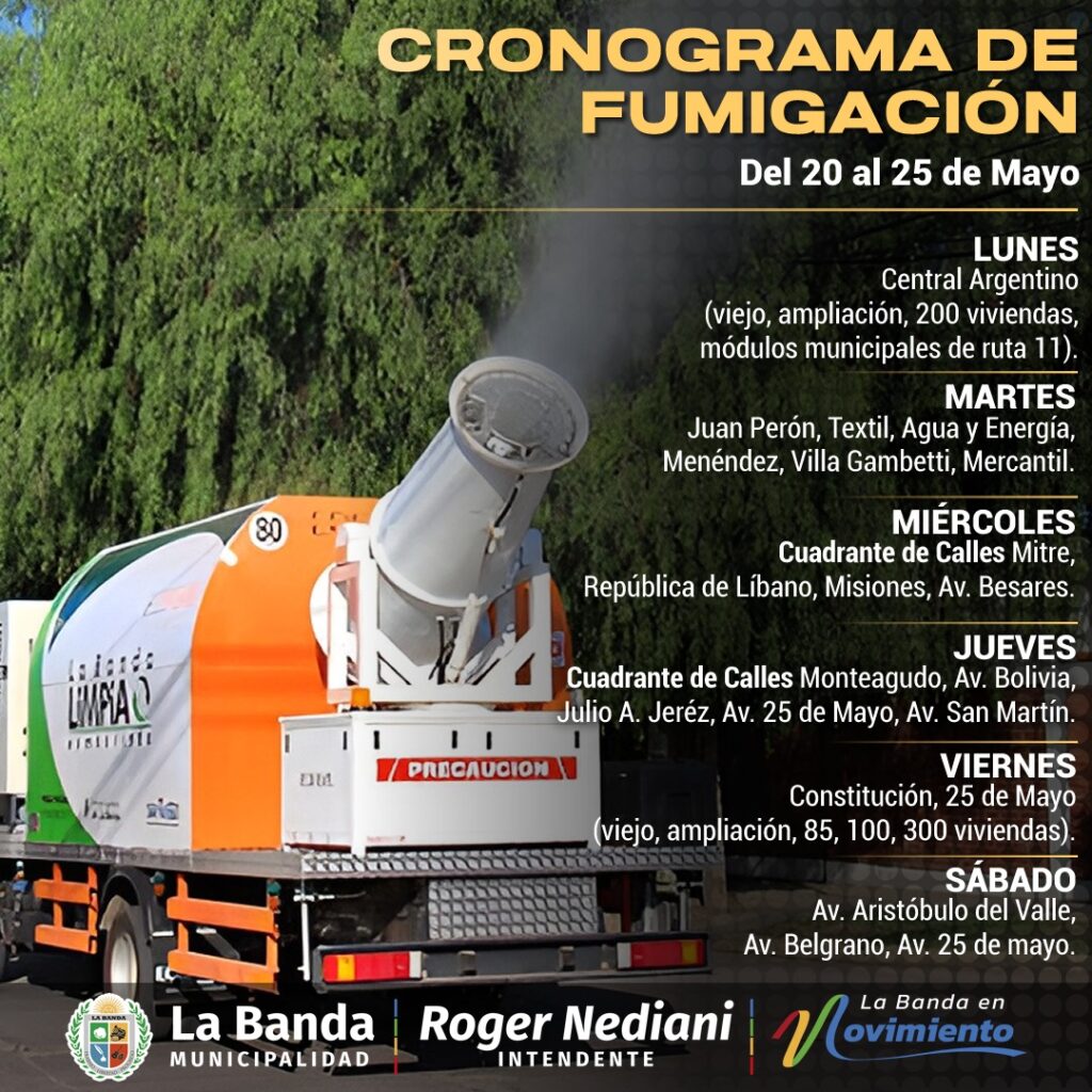 La Secretaría de Servicios Públicos de la Municipalidad de La Banda informa el cronograma de fumigación que se llevará a cabo del lunes 20 al sábado 25 en la ciudad de La Banda