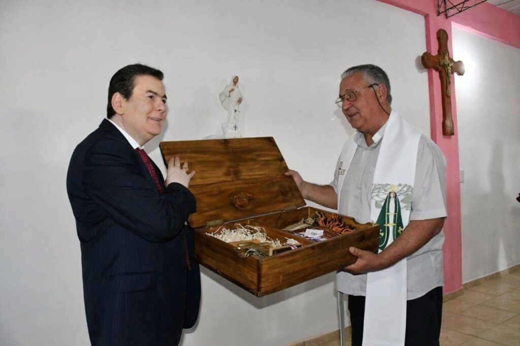 Después de haber dejado habilitado dos edificios educativos en Lote La Cañada y entregado 27 viviendas sociales, el mandatario compartió la ceremonia presidida por el padre Mario Guerrieri, quien junto con los vecinos de la zona le dieron la bienvenida y agradecieron la colaboración de la provincia para la construcción del templo, que también se hizo con aportes de la comunidad y del padre Sergio Marinelli, quien envió un mensaje desde Italia para el gobernador y todos los pobladores de la zona.