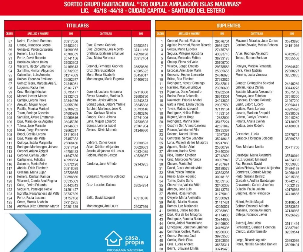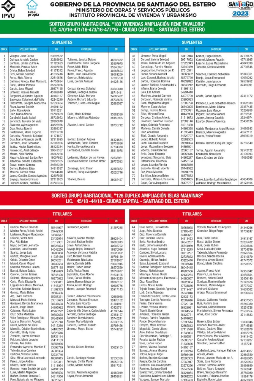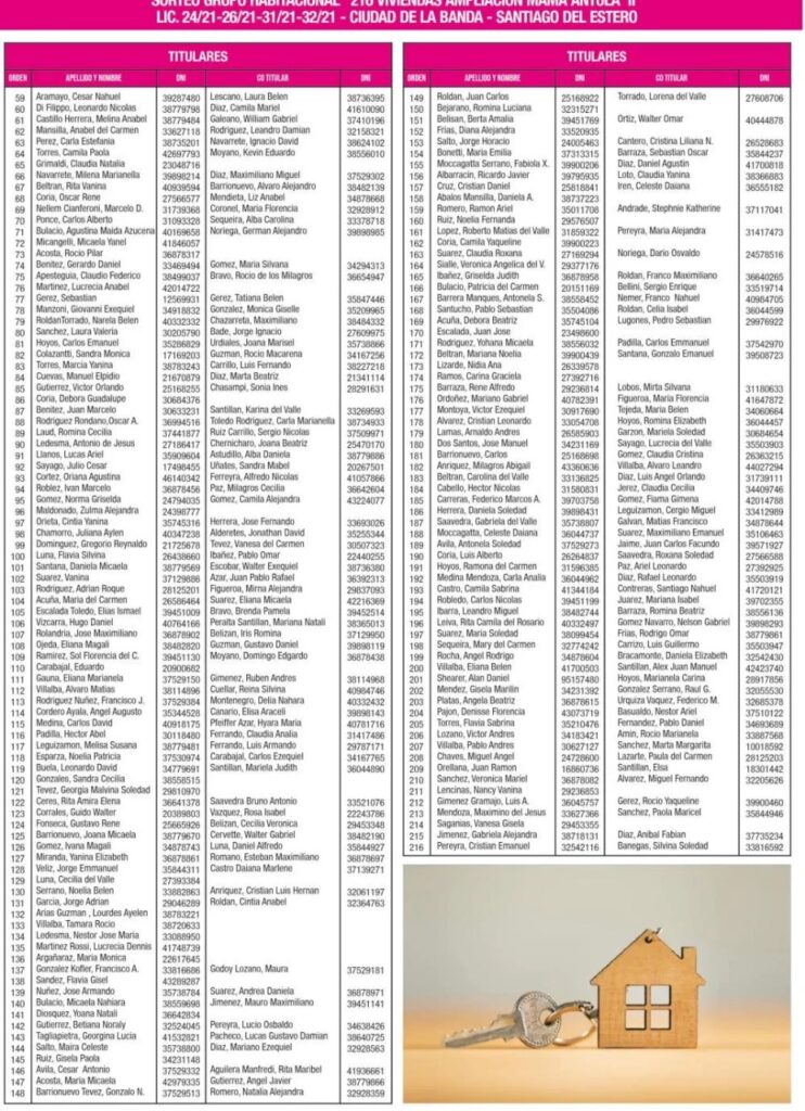 El Gobierno de la Provincia, a través del Ministerio de Obras y Servicios Públicos y el Instituto Provincial de Vivienda y Urbanismo, dieron a conocer la lista completa de los adjudicatarios preseleccionados, para las casas del barrio “Ampliación Mama Antula II”, 180 casas para el barrio “Ampliación René Favaloro” y 126 dúplex para “Ampliación Islas Malvinas”.