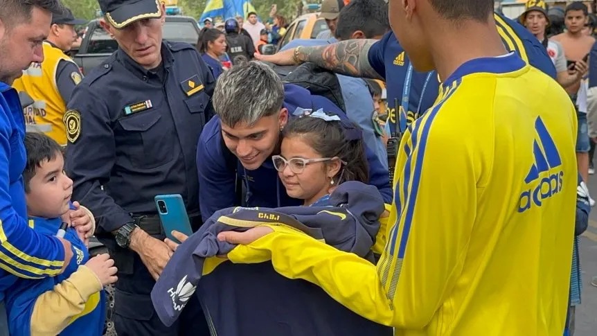Los jugadores frenaron para sacarse fotos con los simpatizantes y firmar algunos autógrafos. El furor por Boca, que jugará la semifinal de la Copa Libertadores dentro de 10 días ante Palmeiras, en Santiago fue tal que los más fanáticos desplegaron una gran bandera que cubrió la puerta del hotel con el escudo del cuadro de La Ribera.