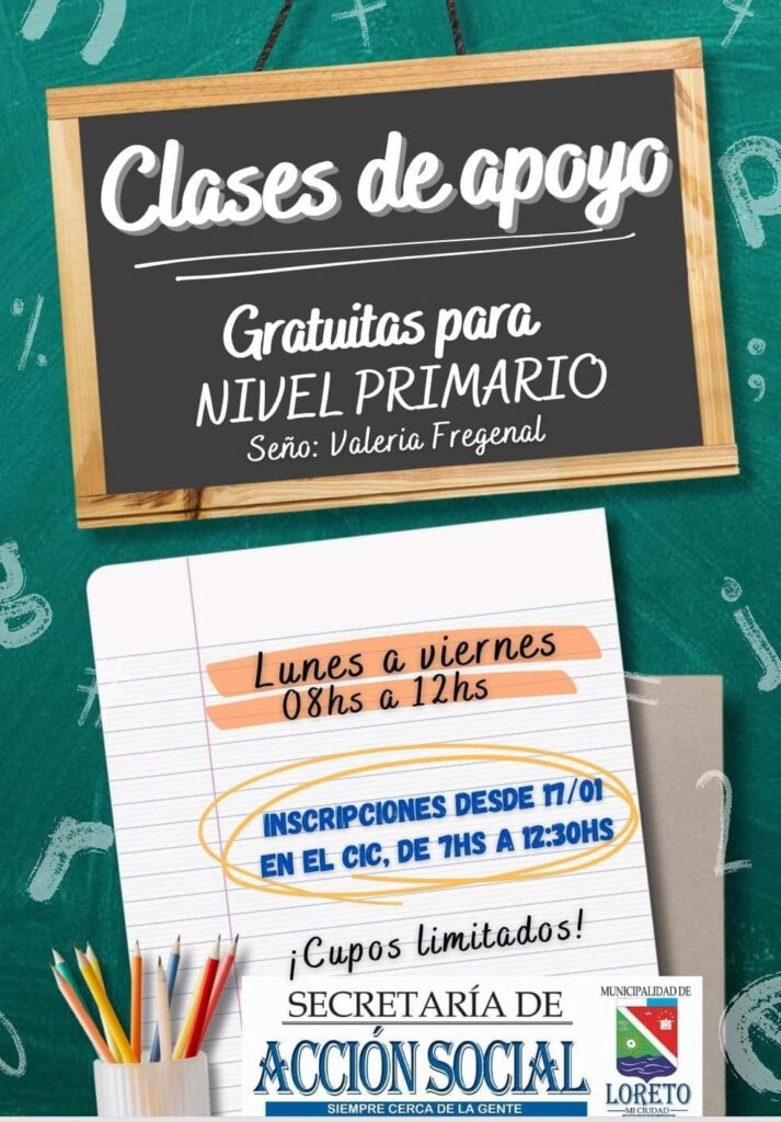 Alumnos que cursan el Nivel Primario podrán acceder a clases gratuitas de apoyo escolar que brinda la Municipalidad de Loreto, a través de la Secretaría de Acción Social.