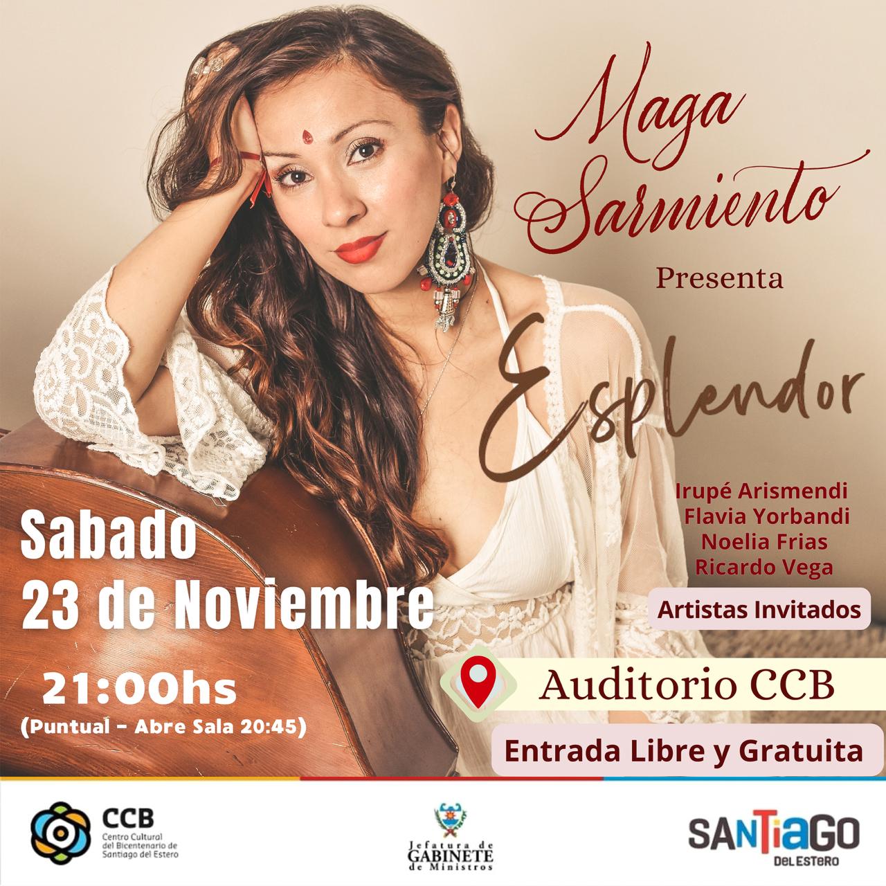 El Centro Cultural del Bicentenario (CCB), invita a la presentación del disco “Esplendor”, de la artista santiagueña Maga Sarmiento. El evento tendrá lugar el próximo sábado 23 de noviembre, a las 21 horas, en el Auditorio del CCB.