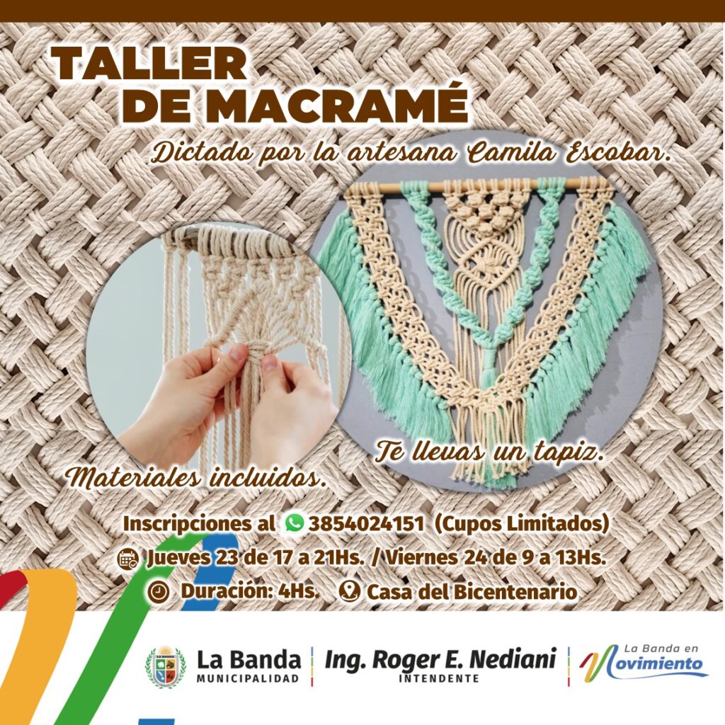 La Municipalidad de La Banda invita a la comunidad a participar del Taller de Macramé que se llevará a cabo en la Casa del Bicentenario que se llevará a cabo el jueves 23 de 17 a 21 y el viernes 24 de 9 a 13.