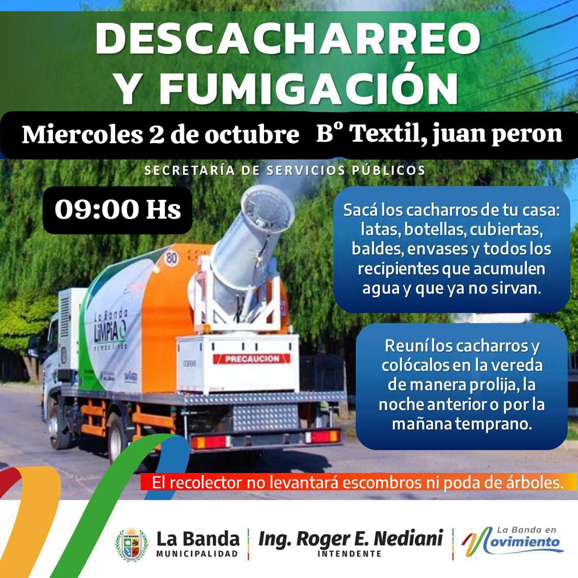 La Municipalidad de La Banda, a través de la Secretaria de Servicios Públicos llevará a cabo este miércoles 2 de octubre a partir de las 9 un operativo de fumigación y descacharreo para prevenir la propagación del mosquito Aedes Aegypti, en los barrios Textil y Juan Perón.