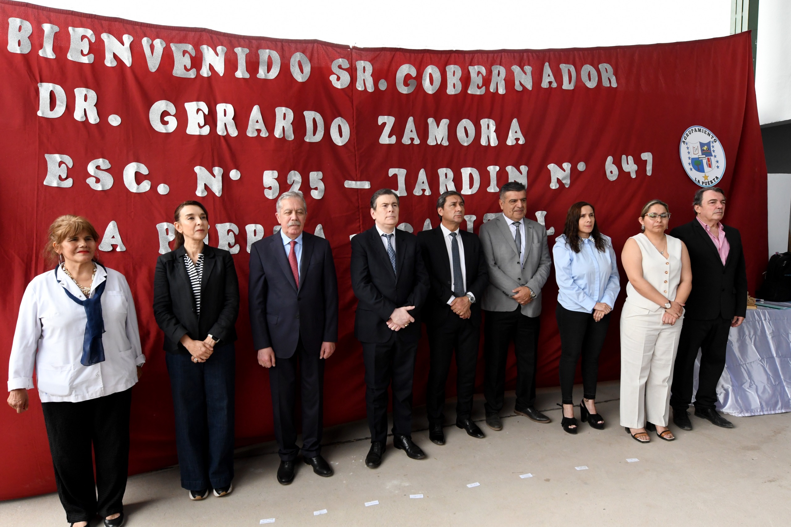 La localidad de La Puerta, ubicada en el departamento Capital cerca del límite con Río Hondo, recibió este lunes la visita del gobernador Gerardo Zamora, quien dejó formalmente inauguradas las renovadas instalaciones de la Escuela Nº 525, para 16 alumnos, donde también funciona el Agrupamiento Educativo de Nivel Medio Nº 86.034/35, con 86 estudiantes de la zona, y del Jardín de Infantes Anexo Nº 647, a donde concurren 5 niños.