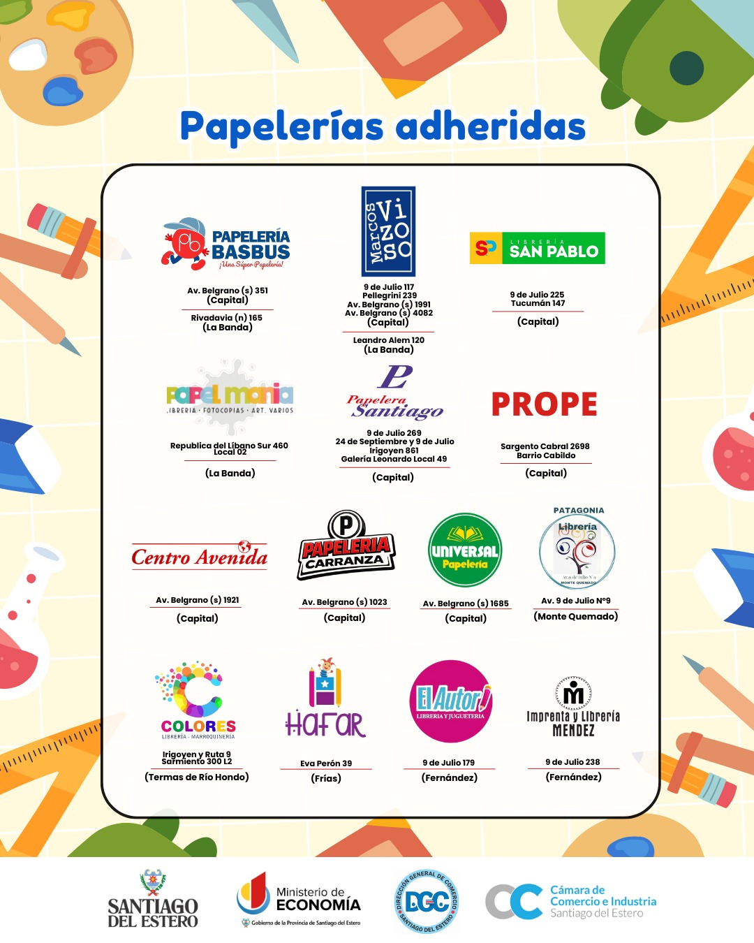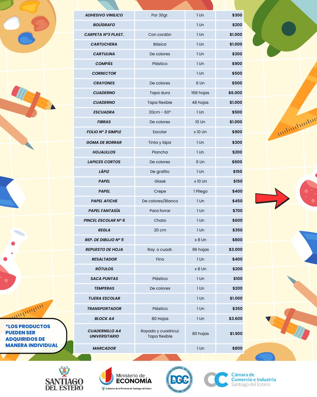 El Gobierno de la provincia, a través del Ministerio de Economía, dio a conocer el Listado de Precios Escolares Santiagueños Sugeridos, compuesto por 34 artículos que estarán disponibles desde este martes 10 de febrero hasta el 31 de marzo en librerías adheridas de ciudad Capital, La Banda, Frías, Termas de Río Hondo, Monte Quemado y Fernández.