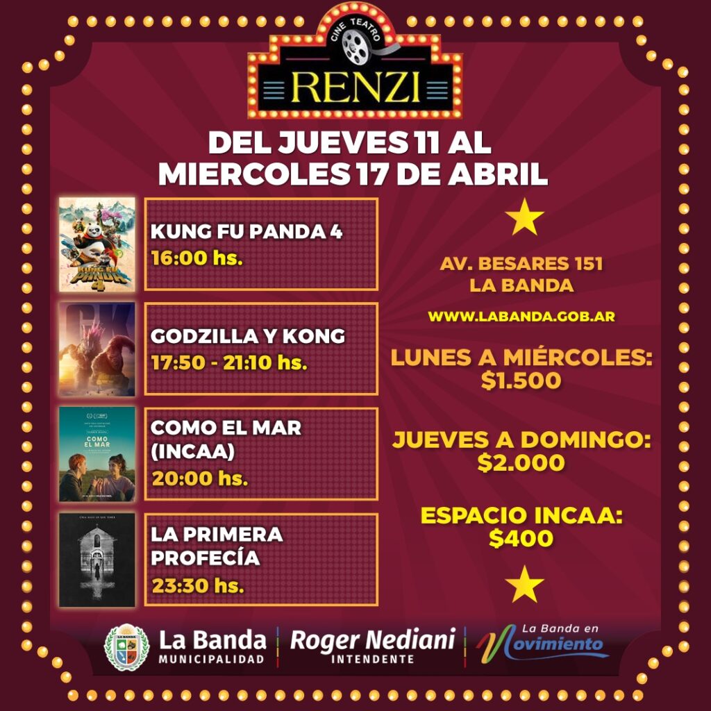 Finalmente desde el área se indicó que las películas que se encuentran en cartelera son: “Kung Fu Panda 4” a las 15:30; “Como el mar” (Espacio INCAA) a las 19:30; “Godzilla y Kong: el nuevo imperio” a las 17:20 y 21:10; y “La primera profecía” a las 23.30.