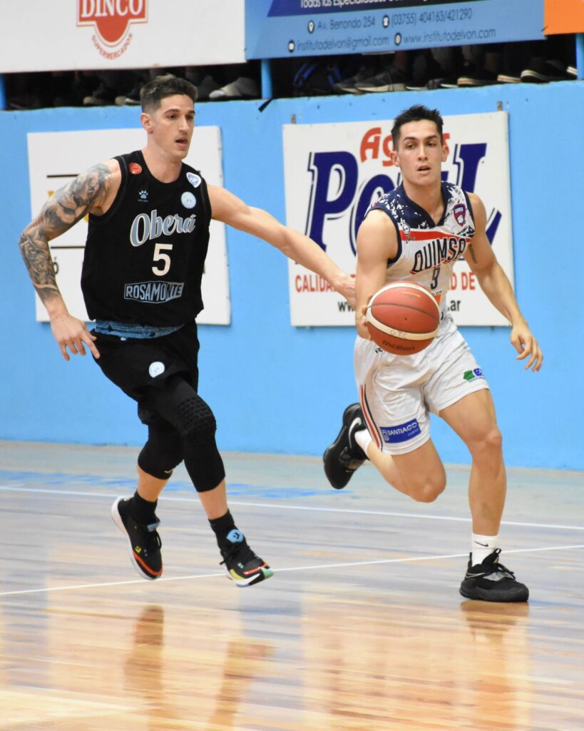 El primer cuarto tuvo a Baralle (10 puntos) como protagonista junto a Cosolito (5) para un elenco visitante mejor parado en defensa conteniendo a De Los Santos y a Maldonado. Carreras obtenía el primer triple para Oberá en su quinto intento para descontar cifras, pero Robinson desde la línea de libres colocaba el 19 a 13 para la fusión. El duelo siguió con un par de triples de Cosolito y Toreta para que Quimsa maneje diferencias. La visita falló cinco ofensivas consecutivas y Maldonado (2 bombas) junto a Mitchell le dieron el liderazgo al celeste misionero (30 – 29 con 3’45”), el cierre de la primera mitad fue palo a palo, unas asistencias largas para Torresi le permitió a Oberá colocar el 41 a 37.