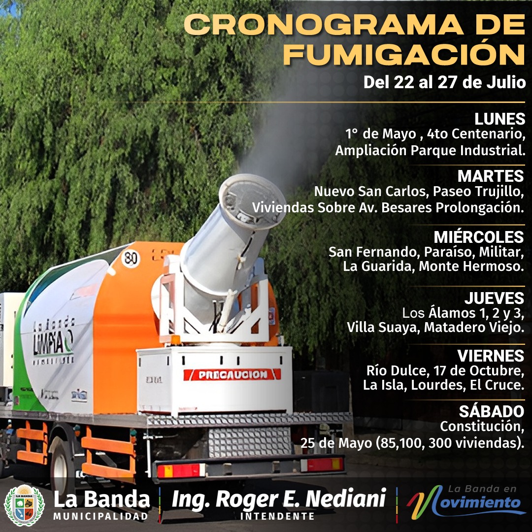 La Secretaría de Servicios Públicos de la Municipalidad de La Banda dio a conocer el cronograma de fumigación que se desarrollará en los barrios de la ciudad desde el lunes 22 al sábado 27.