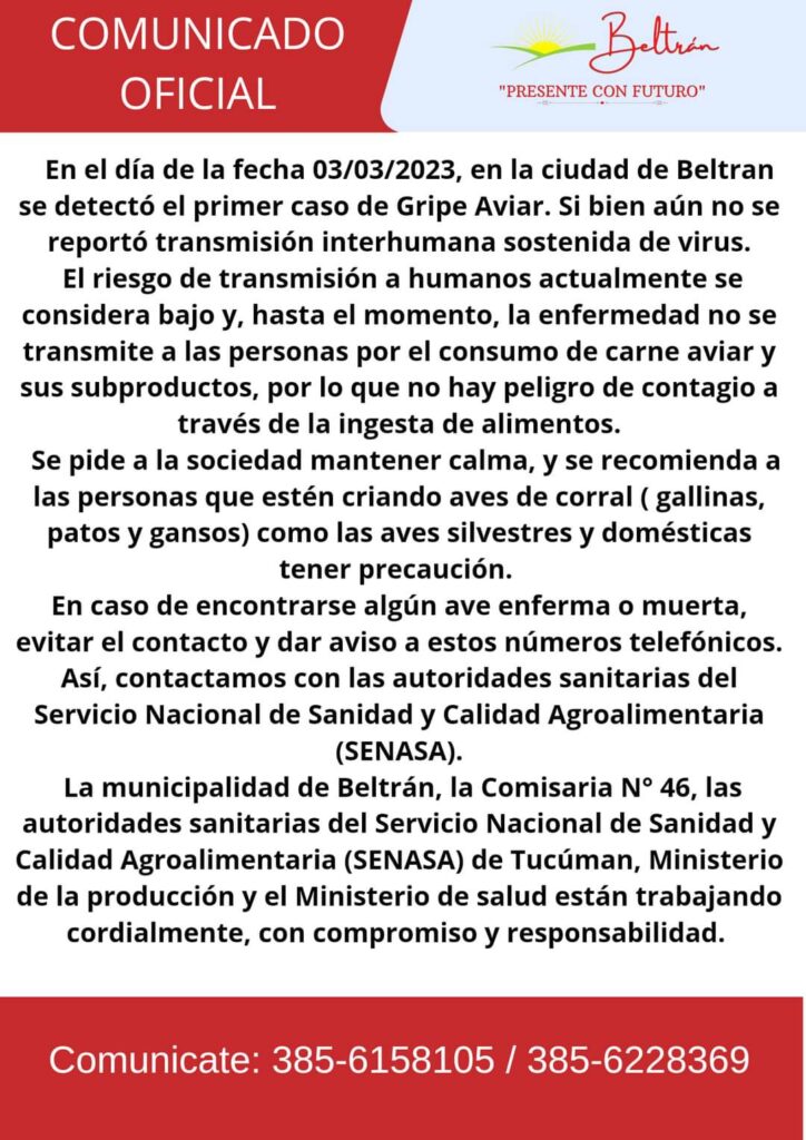 En caso de hallar algún ave enferma o muerta, evitar el contacto y dar aviso de inmediato a las autoridades mediante los siguientes teléfonos: 385-6158105 / 385-6228369