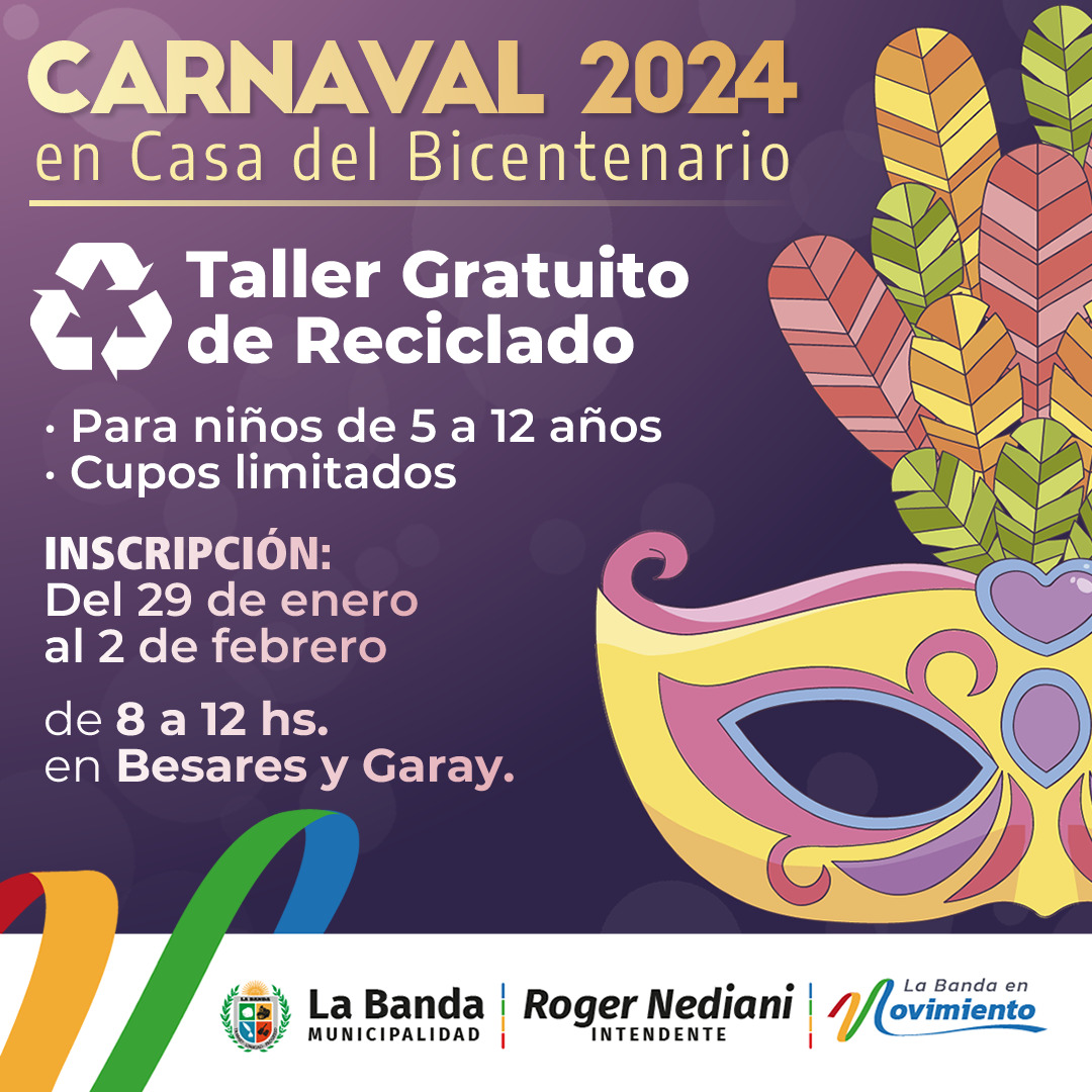La Casa del Bicentenario de La Banda, dependiente de la Secretaría de Gobierno, invita a la comunidad a participar de manera gratuita del “Taller de Reciclado” en el marco de las festividades programadas por la llegada del Carnaval 2024.