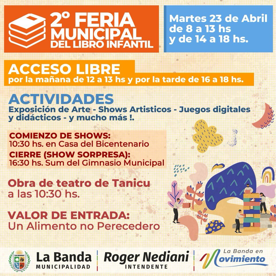 La Municipalidad de La Banda, por intermedio del Intendente, Ing. Roger Elías Nediani, invita a la comunidad a participar de la 2° Edición de la Feria Municipal Del Libro Infantil, con fines solidarios.