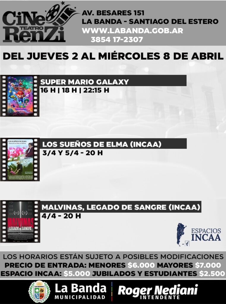 El Cine Teatro Renzi dio a conocer su programación correspondiente del 2 al 8 de abril, destacando el esperado estreno de “Super Mario Galaxy”, una propuesta pensada para toda la familia que llega a la pantalla grande con múltiples funciones. La película se proyectará en los horarios de 16:00, 18:00 y 22:15, ofreciendo una alternativa ideal para grandes y chicos que deseen disfrutar de una experiencia cinematográfica llena de aventura, diversión y emoción.