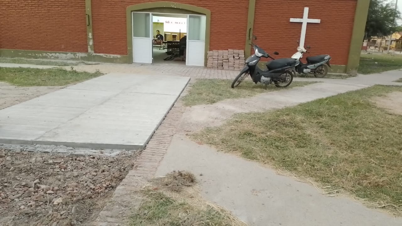 Con la colaboración de empleados de La Municipalidad de Pinto, departamento Aguirre, la comisión de la capilla San Cayetano del barrio Islas Malvinas lleva adelante trabajos para renovar el piso de este lugar.