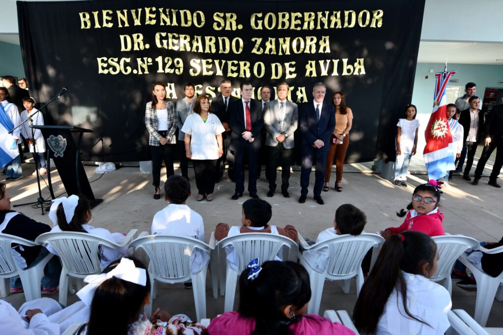 Luego se trasladó a la Escuela N° 129 “Severo de Ávila”, donde fue recibido por la directora Teresita Bustamante, padres, vecinos y alumnos. Tras el corte de cintas y el descubrimiento de la placa recordatoria, se hizo un recorrido por establecimiento que fue reconstruido por completo y que ahora cuenta con tres aulas, dirección, cocina comedor con fogón, sanitarios; una galería con una superficie aproximada de 280 metros cuadrados; un amplio patio de formación cubierto y cerca perimetral.