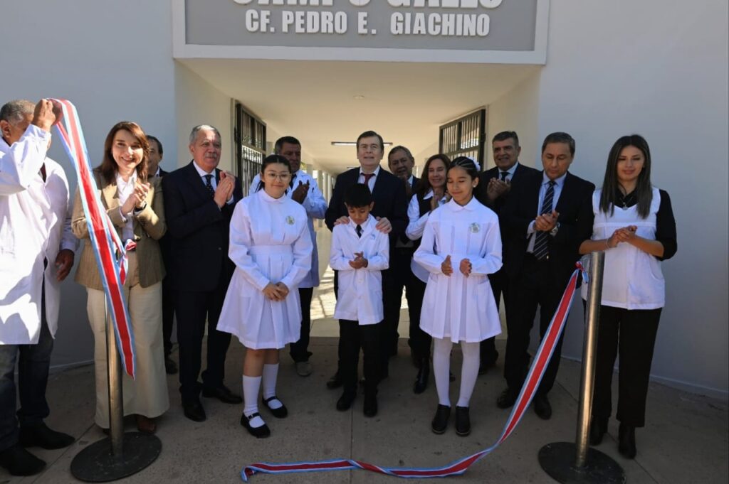 Luego se realizó la inauguración de las obras en la Escuela Nº 913 “Pedro Edgardo Giachino”, donde las autoridades fueron recibidas por el director Oscar Sayago, quien los acompañó en el recorrido por las instalaciones del edificio que cuenta con dirección, secretaria, sala de música, laboratorio, biblioteca, sala de informática, internet, baños, salón de uso múltiples, espacio nucleado, jardinería, sección deporte y comedor para un total de 884 alumnos en los turnos mañana y tarde.