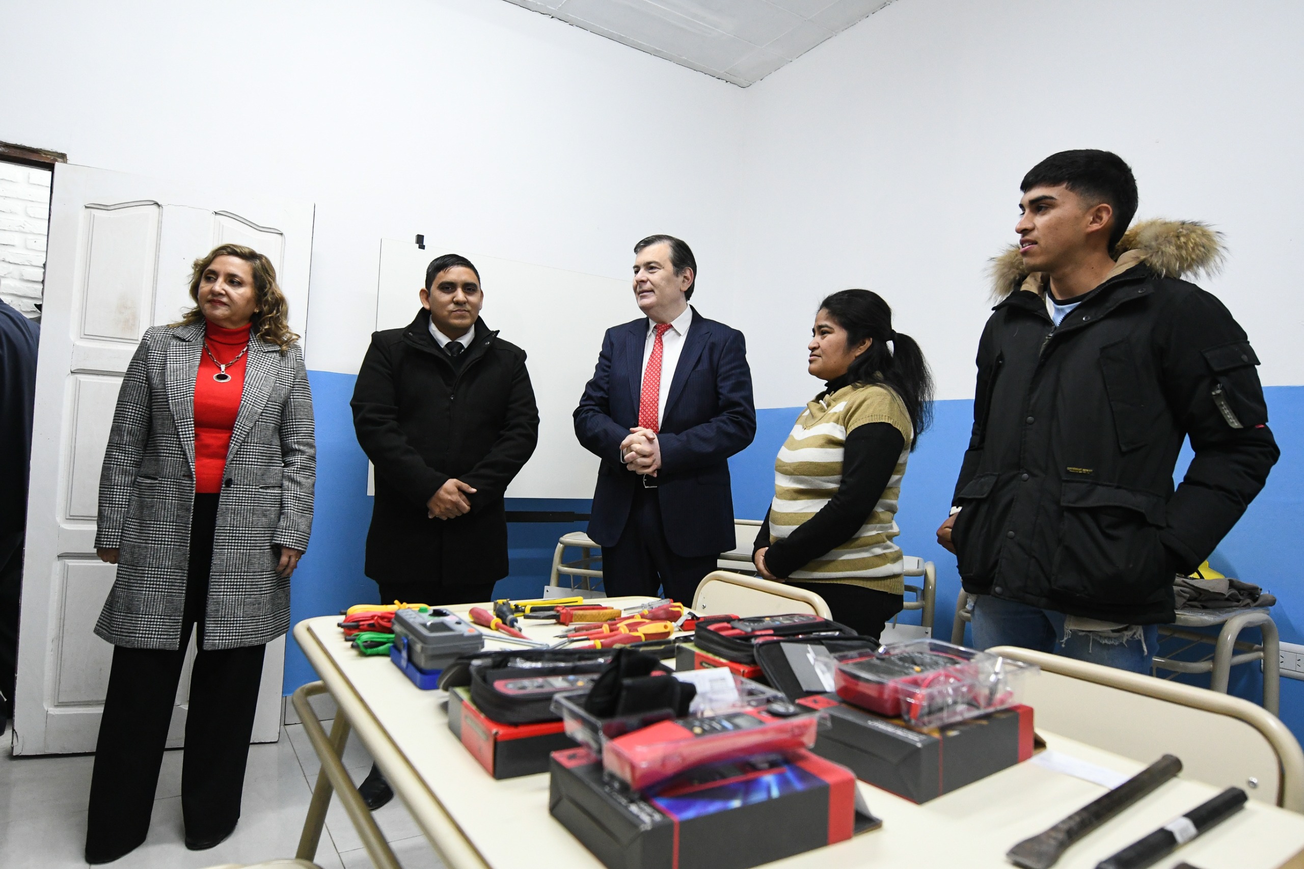 Estuvo acompañado por el vicegobernador Carlos Silva Neder y los ministros de Educación, Mariela Nassif y de Obras Públicas, Aldo Hid. Además de la presidente del Consejo General de Educación, María Elena Herrera; el secretario de Obras Públicas, Jorge Zuaín y la intendente Norma Fuentes, quienes fueron recibidos por la directora del establecimiento del Nivel Primario, María de los Ángeles Pereyra, junto con la directora del Centro de Capacitación, Andrea Steinle.